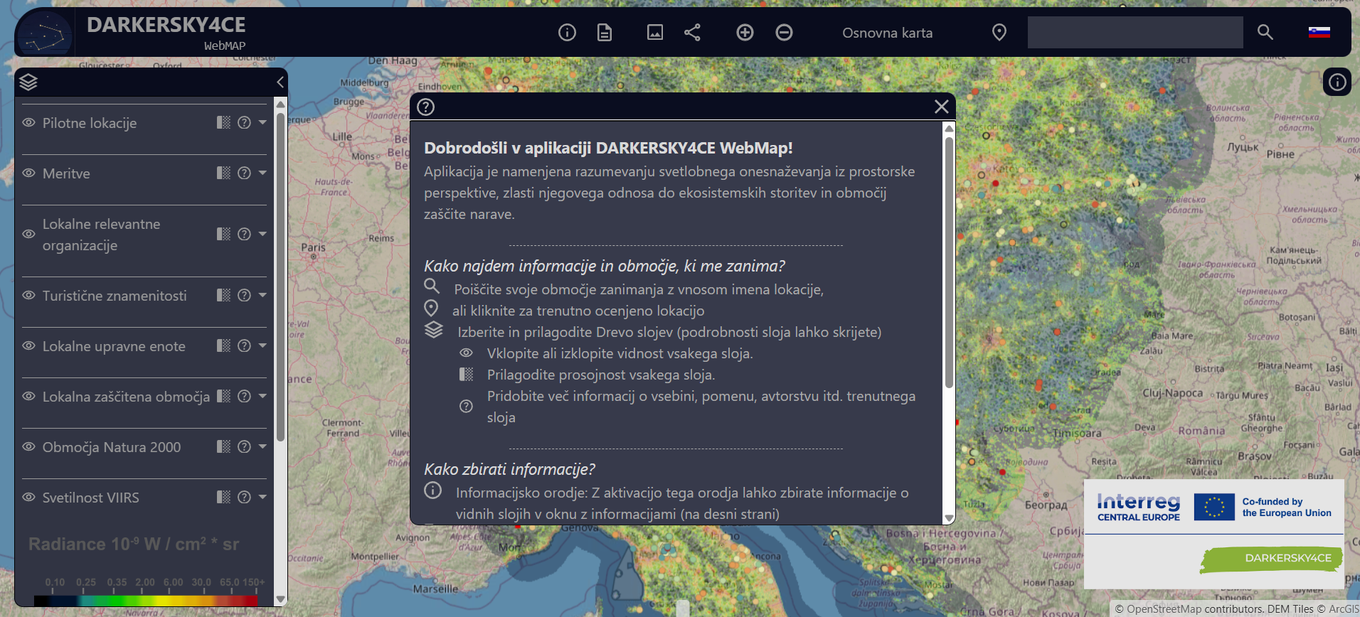 Interaktivna GIS mapa projekta DARKERSKY4CE, ki prikazuje prostorsko porazdelitev svetlobnega onesnaženja v Srednji Evropi. Na levi strani je legenda (seznam slojev), ki vključuje pilotne lokacije, meritve, lokalne relevantne organizacije, turistične znamenitosti, lokalne upravne enote, lokalna zaščitena območja, območja Natura 2000, podatke o svetlobnem onesnaženju (svetilnost VIIRS) in svetlost neba. V sredini je prikazano uvodno okno z besedilom dobrodošlice in osnovnimi navodili za uporabo, v ozadju pa je vidna GIS mapa s prostorsko porazdelitvijo svetlobnega onesnaženja v Srednji Evropi. V spodnjem desnem kotu se nahaja logotip projekta DARKERSKY4CE programa Interreg CENTRAL EUROPE.